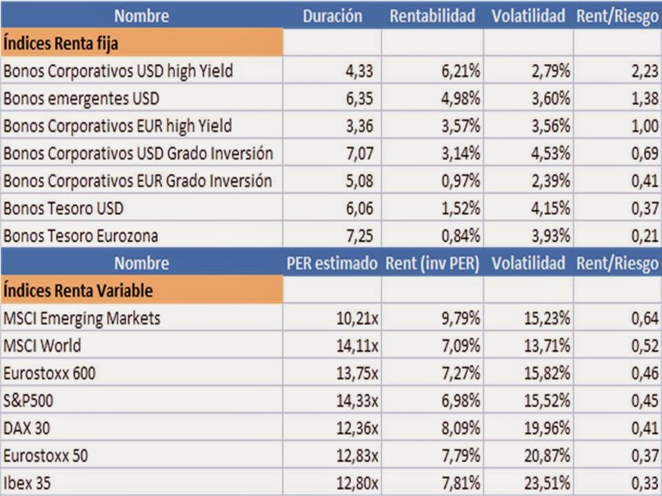 En el día de ayer llegamos a la conclusión de que las tendencias de largo plazo son alcistas tanto en los principales índices de renta variable como activos de renta fija. Evidentemente en toda tendencia alcista se producen movimientos contra tendencia que generan periodos de incertidumbre y los inversores se empeñan en buscar techos donde no los hay. Desde el punto de vista de largo plazo vimos que aún puede haber correcciones pero las tendencias de largo plazo para nada están en peligro. Y mientras estemos en una tendencia alcista de largo plazo, la forma de operar es aprovechar las correcciones para comprar y los repuntes para deshacer parte de lo comprado. Nunca quedarse sin riesgo y nunca operar contra la tendencia (es decir apostar a la baja) porque las subidas suelen ser más grandes que las correcciones.No obstante, tal y como vimos ayer, a pesar de estar en tendencia alcista hay activos en los que no tiene lógica estar puesto que la rentabilidad potencial que ofrecen ya no compensan el posible riesgo en precio de una mera corrección en la tendencia. Ayer en grandes rasgos llegamos a la conclusión de que la renta variable ofrecía mejor binomio rentabilidad riesgo era para la renta variable, pero en el día de hoy vamos a intentar ver qué activo dentro de la renta fija y de la renta variable ofrecen mejor binomio rentabilidad riesgo.En el siguiente gráfico se aprecia la evolución de los principales índices de renta fija en los cinco últimos años. Bonos de gobierno de Estados Unidos y de la zona euro, bonos corporativos de grado de inversión y de High Yield de ambas zonas y bonos emergentes en dólares.En la leyenda del gráfico he puesto las volatilidades anualizadas de los últimos cinco años de estos activos. Curiosamente los fondos high yield y bonos emergentes no tienen más volatilidad que los de grado de inversión, e incluso los bonos del tesoro de la zona euro tienen más volatilidad (riesgo) que los bonos corporativos de esta zona. En la siguiente tabla he puesto la duración y rentabilidad que ofrecen en la actualidad los índices de bonos del gráfico anterior. En la última columna he puesto un simple ratio de rentabilidad partido riesgo. Ordenándolo por esta columna vemos que los bonos high Yield y emergentes ofrecen un mejor binomio rentabilidad riesgo que los bonos de grado de inversión, y los bonos corporativos en general ofrecen mejor binomio que los bonos de gobierno.Sin duda alguna la explicación viene motivada por el mayor cupón. Estamos en un periodo de crecimiento global y, por tanto, menor riesgo de default de las compañías. El mayor cupón es un claro efecto amortiguador en caso de correcciones como las vividas en este último mes. Evidentemente, con el bono alemán a 10 años al 0.07% de tir que vimos a mediados de abril un repunte de un 0.5% de los tipos de interés el efecto en precio es mucho mayor que cuando el repunte es a partir de una tir de un 3%-4%. Así pues, si confiamos que las economías seguirán creciendo y el riesgo de default continuará menguando, es mejor estar en corporativos y high yield que en bonos de gobierno.En la tabla también he puesto los principales índices de renta variable intentando hacer una similitud con los bonos. La rentabilidad la medimos por el inverso del PER estimado y la volatilidad es también la anualizada de los últimos cinco años. Ordenado por binomio rentabilidad riesgo tenemos mejor posicionado a la renta variable emergente, global y Europa global, que Estados Unidos y países como España.