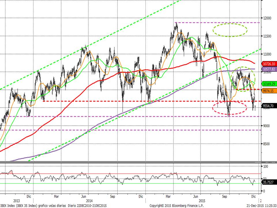 En el Ibex 35 tenemos que esta mañana hemos abierto justo en la zona de mínimos de la semana pasada y desde la apertura se está produciendo un ligero rebote. La zona de 9.200 puntos sigue siendo un nivel de soporte claro para nuestro selectivo.