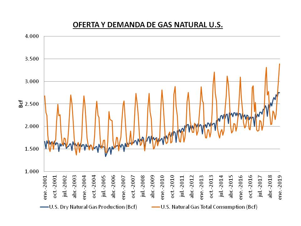 Figura.- Evolución de la producción y demanda de gas natural en U.S. Datos en miles de mil de pies cúbicos (Bcf), Fuente EIA: Natural Gas Monthly