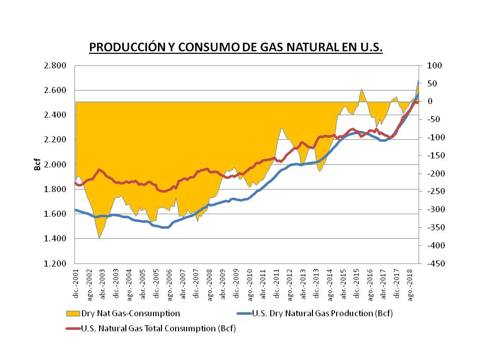 En esta evolución hay que destacar la importancia de la explotación del shale gas, que constituye la mayor parte de la producción de gas natural estadounidense, de tal forma que en diciembre de 2018, la producción de gas no convencional llegó a los 65bcfd, un 70% de la producción total de dry natural gas.