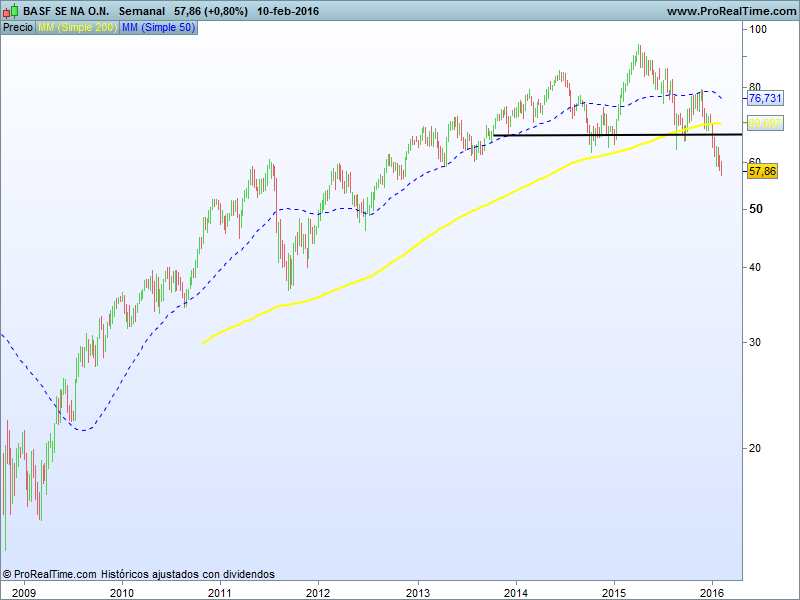 Clave en esta evolución es el indice de referencia alemán, el DAX se encuentra en un punto técnico bastante decisivo para el futuro de sus componentes. se encuentra en la base del canal alcista que mantiene desde la crisis financiera de 2008, coincidiendo este con la media móvil de 200 sesiones entorno a los 8800 puntos, romper este nivel supondría romper los mínimos de octubre de 2014, romper canal alcista y situarse por debajo de la MM200, por lo que se iría a los 8000 puntos como primer e importante soporte.