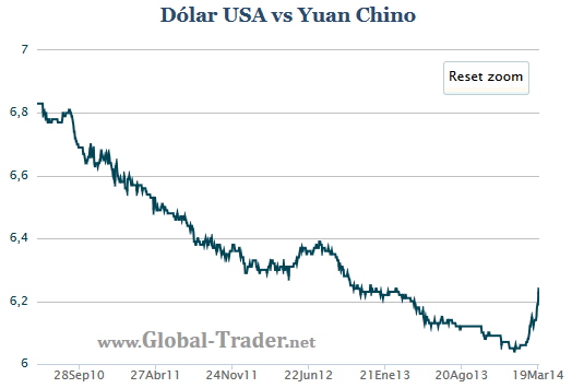 Hace unos días el gobierno chino decidió ampliar el rango de fluctuación del Yuan frente al dólar, del 1% al 2% diario, es decir, doblarla (lo cual tiene mucho más efecto cuanto más ampliamos el horizonte, considerando la capitalización compuesta).