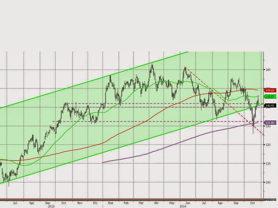 Por tanto, a corto plazo puede continuar lo que venimos comentando. Una fase “lateral” entre los máximos de hoy y los mínimos no tanto de los de hace dos jueves, sino entre unos soportes intermedios. Entiendo que la zona de 10.000 puntos del Ibex, 2.930 del Eurostoxx y 1.900 del S&P500 deben funcionar como zona de soportes a corto plazo. Ahí debería volver a entrar dinero en los activos de riesgo. Sobre todo porque los datos macro aunque no son del todo espectaculares, no están siendo peor de lo esperado y los beneficios empresariales del tercer trimestre mejoran expectativas tanto en Estados Unidos como en Europa.