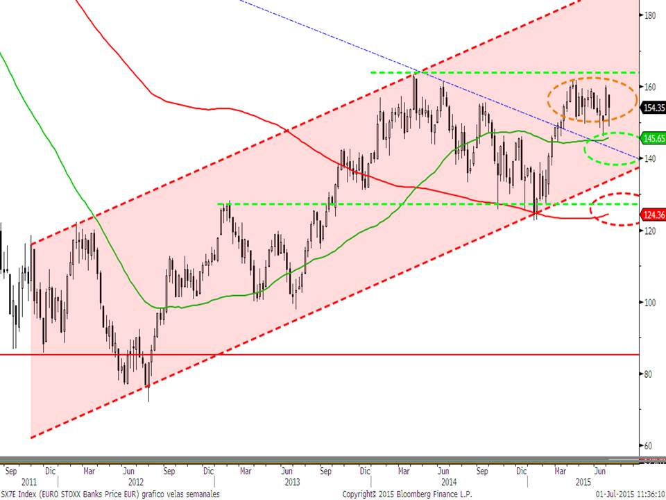 Incluso el sectorial bancario que debería ser el más penalizado por el riesgo de la quiebra de Grecia se mantiene en un claro rango lateral (rodeado en naranja), justo al borde de la resistencia de los máximos del año pasado. Si los rompe al alza nos disparamos hacia arriba y todos los inversores que han vendido volverán a entrar tarde en el festival.