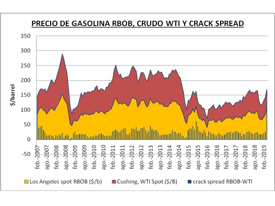 Lógicamente, los crack spread, como se muestra en la figura siguiente, suelen ser positivos, lo que no excluye que puntualmente puedan presentar valores negativos. Y su valor dependerá de los precios relativos de los productos refinados considerados y tipo de crudo utilizado como referencia. Siendo un factor a tener en cuenta que los precios de los derivados se encuentran condicionados por factores locales y estacionales, utilizándose como indicadores de las condiciones de oferta y demanda en un mercado determinado.