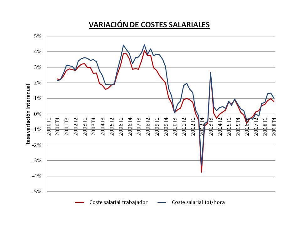 En la gráfica siguiente se muestra el incremento de costes que se produjo previamente a la crisis y el posterior ajuste, llevándose a cabo el máximo ajuste en el 4T de 2012, para posteriormente, a partir de 2017, comenzar a incrementarse los salarios y con ellos los costes laborales unitarios , lo que no implica que no se produzca simultáneamente una pérdida de poder adquisitivo como resultado de mayores incrementos de inflación.