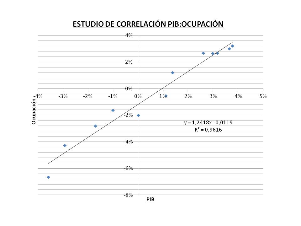 De la gráfica se deduce que a partir de un crecimiento del PIB del 1% el número de ocupados aumenta, y que por cada 1% de incremento de PIB adicional, el número de ocupados se incrementa un 1,24%, lo que se ha demostrado insuficiente de momento para recuperar los niveles precrisis.