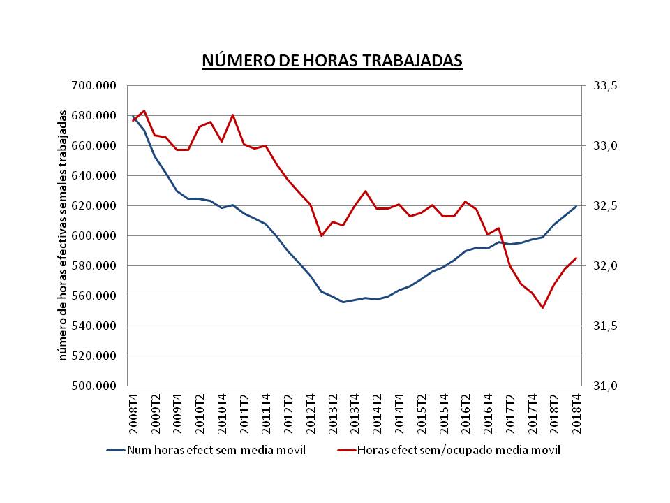 Pero, aunque es importante la evolución del número de ocupados y lo que representan con respecto a la población en edad activa (tasa de actividad: personas activas/personas en edad activa), también es importante determinar el número de horas que trabajan los ocupados y su tendencia.