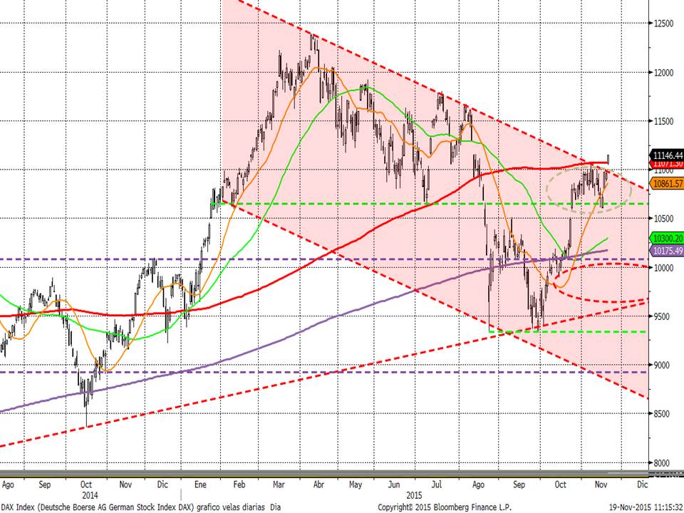 Y en Europa, tal y como decíamos la semana pasada parece que el DAX será el indicador adelantado. Es el más beneficiado por la debilidad del euro y hoy no sólo está superando los máximos de octubre sino que es la media de 200 sesiones y sería superar la directriz bajista iniciada a principios de año.