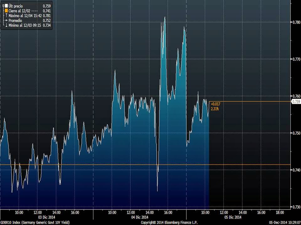 En el siguiente gráfico se aprecia cómo esta mañana el bono alemán a 10 años cotiza justo a la misma rentabilidad de las 14h30 de ayer. Tras varios movimientos de ida y vuelta, vuelve a estabilizarse en esa zona.