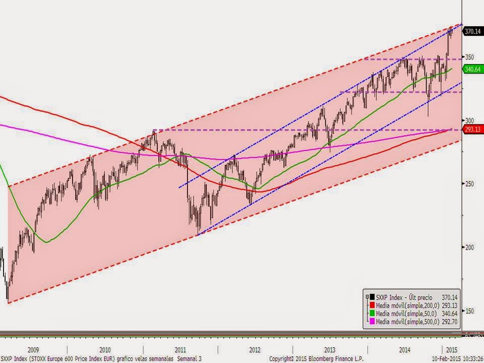 Y en Europa tenemos al Eurostoxx 600 justo en la parte superior del canal alcista iniciado en 2.009 y en el iniciado en 2011.
