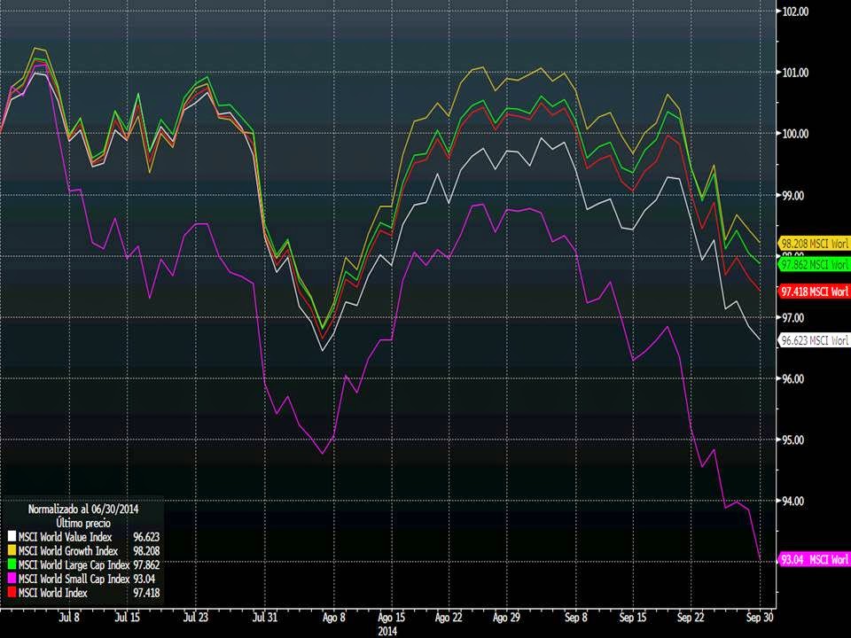 Sin embargo desde que ha comenzado el segundo semestre del 2014, se aprecia claramente cómo las small caps están sufriendo mucho más que el resto de estilos. Desde entonces son las Large caps y el estilo Growth los que mejor están capeando el temporal.