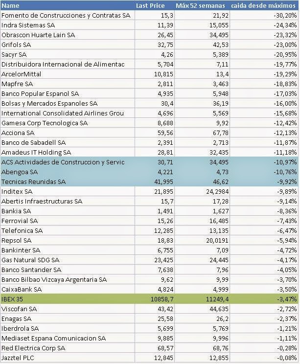 No obstante sí que me gustaría destacar respecto al movimiento de los índices de las últimas semanas, es el comportamiento dispar según el estilo de gestión, zonas geográficas o sectores. A pesar de que los índices están en zona de máximos anuales, o en claro rango lateral, hay muchísimos valores que están muy lejos de los máximos del último año. En la siguiente tabla a modo de ejemplo y usando sólo los valores actuales del Ibex 35 se aprecia que en promedio los 35 valores del Ibex están a más de un 10% de distancia de los máximos alcanzados en las últimas 35 semanas.