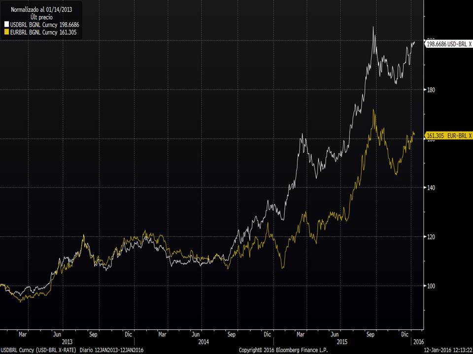 Frente al Real brasileño ocurre algo similar. El dólar se ha revalorizado un 98% y el euro un 61%.