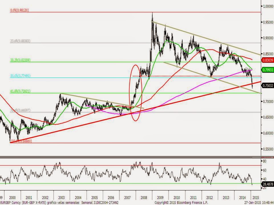 Evolución del Euro frente a la Libra (GBP). Vemos un claro soporte en la zona de 0.725 libras por euro. En este nivel está la base del canal bajista desde 2.009 y el último retroceso desde los mínimos históricos de este cruce de divisas, así como la zona de máximos de 2.003. Igualmente el RSI está en línea de mínimos históricos marcando clara sobreventa, similar a la de 2012.