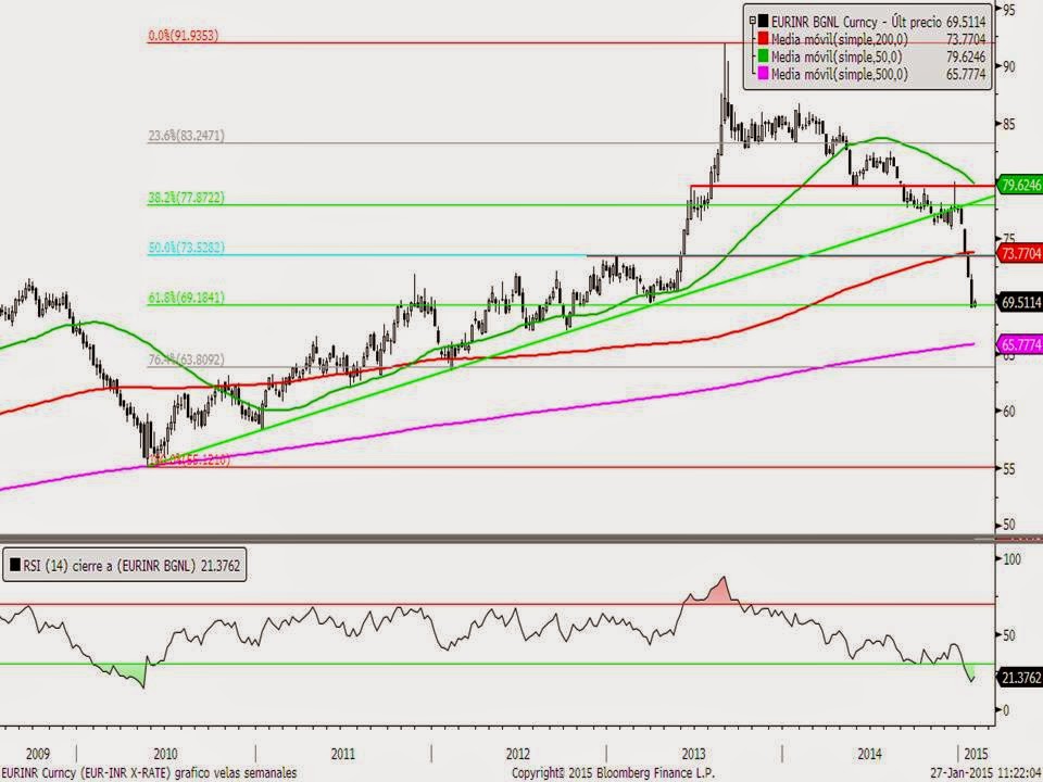 Frente a la rupia india el soporte no es tan claro ya que ha perdido la media de 200 semanas y podría seguir corrigiendo hasta la de 500. No obstante, los niveles actuales coinciden con el 61.85 de toda la subida desde 2010 y está muy sobrevendido por RSI.