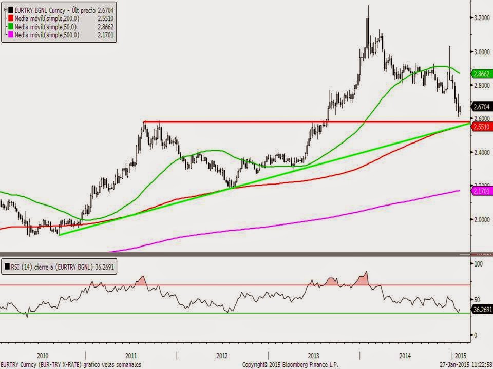 Frente a la lira turca estamos en franca zona de soporte. El nivel de 2.55-2.60 fue resistencia en 2.011 y 2.013 y ahora es soporte. Además por esta zona tenemos la media de 200 semanas y la directriz alcista principal, sin menospreciar que también está sobrevendido si miramos el RSI semanal.