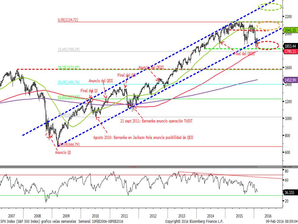 En el S&P500 seguimos pensando que el escenario más probable es un lateral entre los mínimos y máximos desde 2014. Pero si entrásemos en un canal bajista el soporte que vemos más claro lo situamos en 1.600 puntos que es la zona de máximos del 2007 y el 38.2% de recorte de todas las subidas desde 2009.
