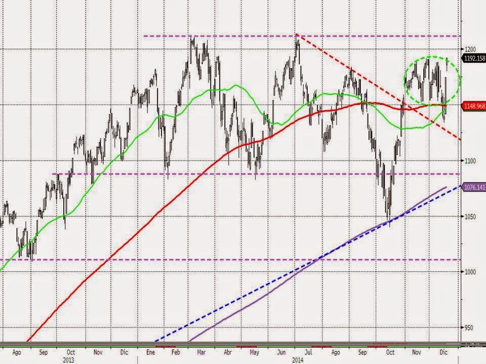 Tras una apertura bastante alcista contagiado de la alegría de los cierres del mercado americano, la subida del petróleo y mejoría del rublo, a media sesión volvemos a las andadas. El Ibex ha tocado el nivel exacto de 10.500 puntos y ya cotiza en 10.250 puntos. ¿El motivo? Realmente ninguno. Seguimos inmersos en un periodo de aumento de volatilidad y ni Europa (Eurostoxx 600) ni las compañías más ligadas a la economía de Estados Unidos (Russell 2000) terminan de salir del lateral en el que llevamos desde principios de año.