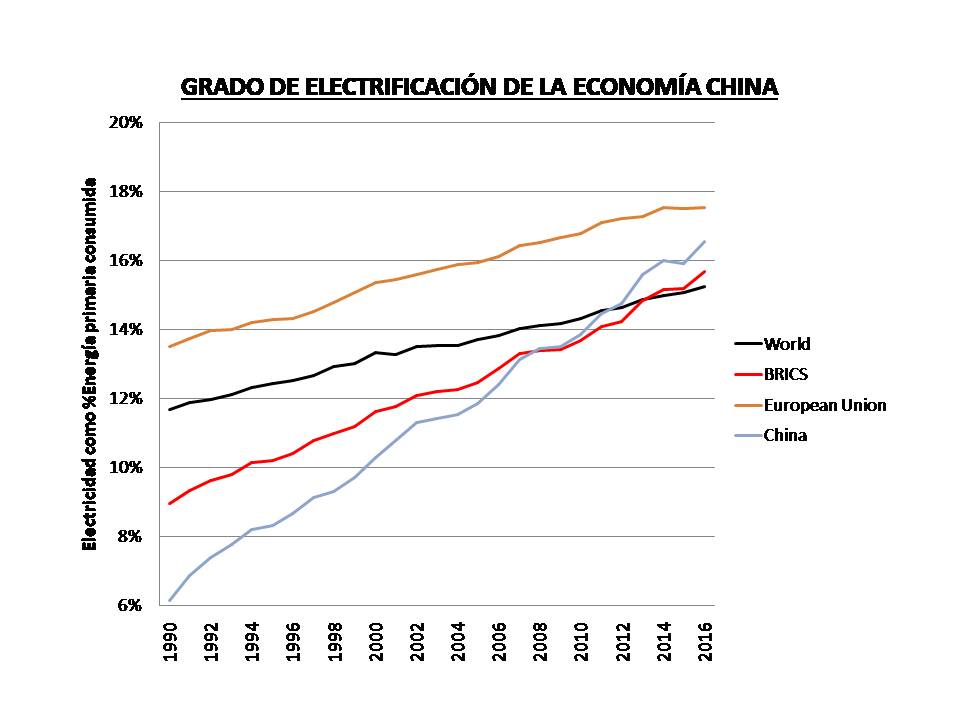 El proceso de electrificación de la economía es global e incluye a China, lo que se ha traducido en que el porcentaje de electricidad producida como porcentaje del consumo total de energía primaria se incrementase, pasando del 6,14% en 1990 al 16,56% en 2016, un incremento superior al mundial, la UE o los BRICS, aunque a pesar de ello el grado de electrificación de la economía es inferior al de la UE (figura siguiente). Pero el dato a considerar es que en este caso, la mayor electrificación de la economía, y por tanto mayor consumo de electricidad, no tendría necesariamente que implicar un incremento del PIB.