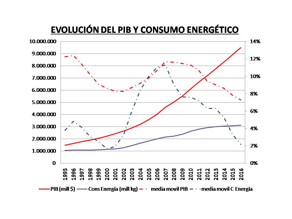 En la figura se aprecia cómo tanto el PIB como el consumo de energía se incrementan en el tiempo, aunque en mayor medida el primero que el segundo. Dato que se aprecía más claramente en el análisis de la evolución de medias móviles, observando un cierto paralelismo entre ambos, produciéndose menores incrementos de ambos a partir del año 2007, pero con la particularidad de que los incrementos de consumo de energía son siempre inferiores a los de PIB real.