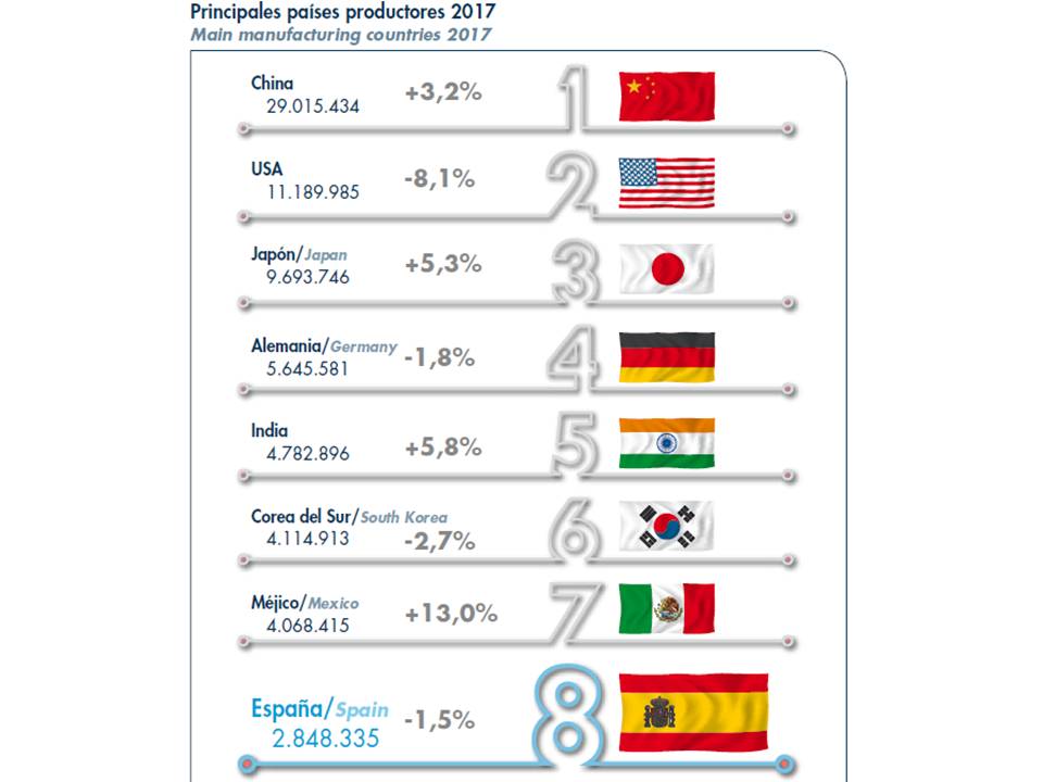 A pesar de ser el octavo fabricante mundial, es de destacar que la producción española supone menos del 10% de la producción china y el 25% de la estadounidense, los dos primeros fabricantes. Aunque si lo comparamos en términos relativos de población, la producción española sobrepasa de forma significativa a ambos países, lo que a su vez implica una mayor dependencia de la economía de este sector.