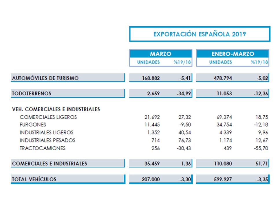En el conjunto del sector, las exportaciones de turismos suponen la mayoría de las exportaciones. Mostrando los datos de ANFAC correspondientes al primer trimestre de 2019 que los turismos han supuesto el 79,8% de las exportaciones (tabla siguiente), y que se han contraído en términos interanuales incluso en mayor medida que la producción, como se puede apreciar en la primera tabla de ANFAC.