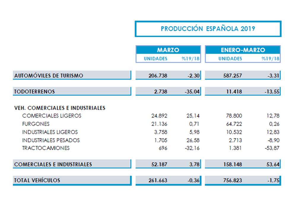 Según datos de ANFAC correspondientes al primer trimestre de 2019, la producción de vehículos muestra a corto plazo una tendencia decreciente (figura siguiente), con cinco meses consecutivos de menor producción (debido a una menor producción de turismos, ya que la de vehículos industriales se ha incrementado), que atribuyen a la debilidad del mercado nacional, con siete meses de caídas, y al descenso de ventas en los principales mercados europeos.