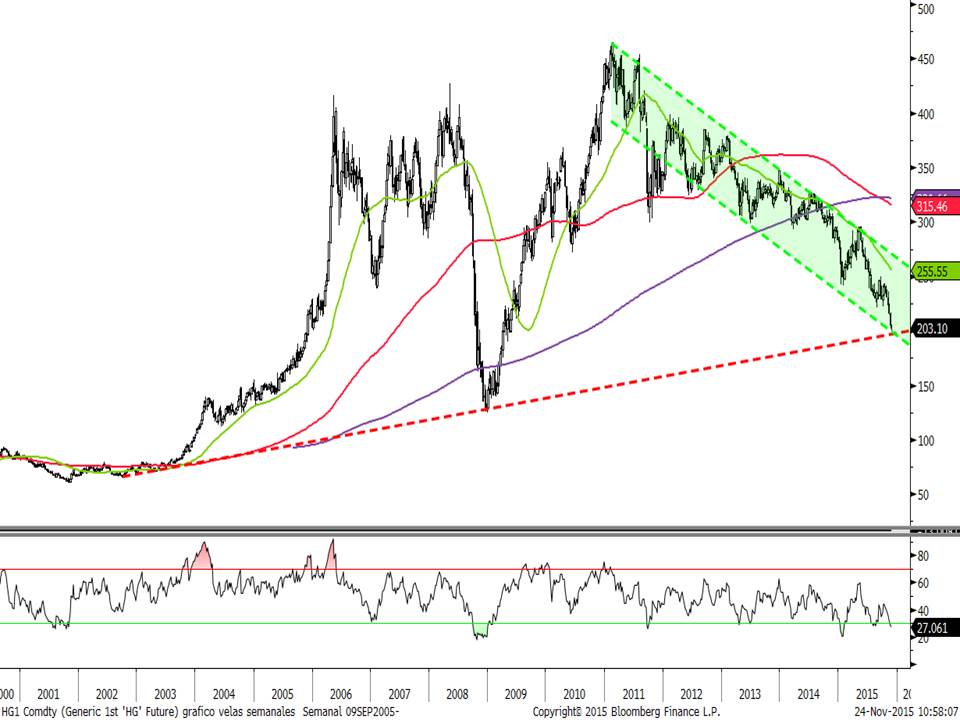 Si miramos el Níquel, ha perforado claramente los mínimos del año y está ahora cotizando en niveles que coinciden con la línea que una los mínimos desde el año 2002 y también hay divergencia alcista en el RSI.
