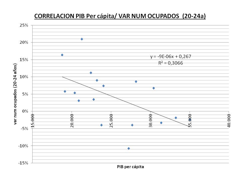 Los datos de la figura anterior muestran una correlación negativa de 0,55 (significativa con p<0,05), entre el PIB per cápita de cada CCAA y la variación del número de ocupados de la población cuya edad comprende los 20-24 años, encontrándose presumiblemente muchos trabajadores de esta edad sujetos al SMI. No siendo esta correlación observada cuando se analiza toda la población trabajadora en relación al PIB per cápita, sugiriendo que las CCAA con menor PIB per cápita son más susceptibles de sufrir, a través de una menor ocupación de los trabajadores jóvenes, los efectos de una subida del SMI.