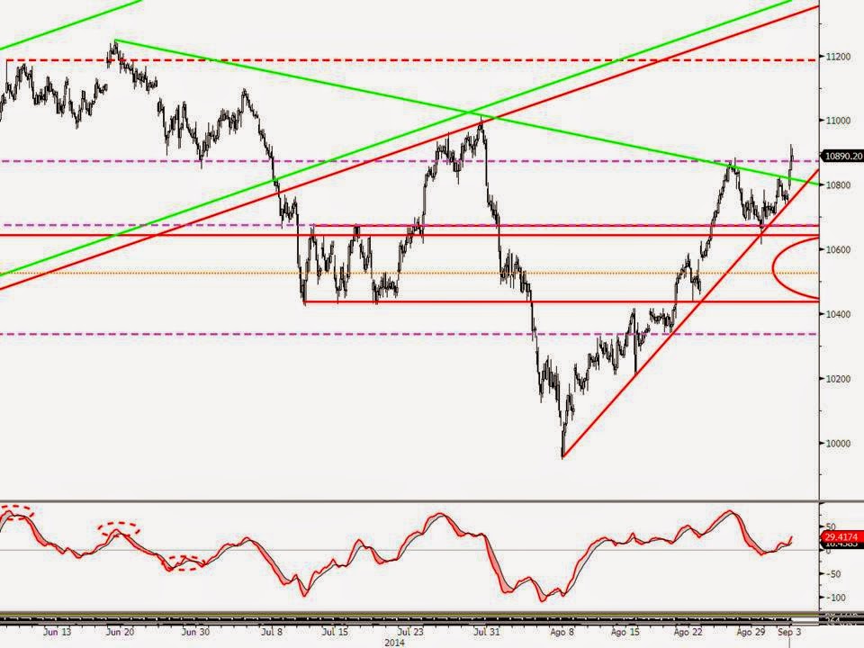 Esta mañana rumores aún no confirmados (parece que un portavoz de Putin niega que se haya llegado a un acuerdo de alto el fuego con Ucrania) de que hay un acuerdo entre Poroshenko y Putin de alto el fuego están provocando que los índices europeos superen las resistencias que comentábamos ayer. El más claro está siendo el Ibex 35 que sube algo más del 1%, disparándose justo al cruzar el nivel de 10.820 que comentábamos ayer.