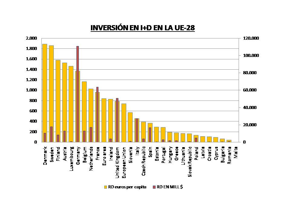 Figura.- Inversión en I+D (RD) en la UE-28 correspondiente al año 2014 en inversión en euros per capita (escala izquierda) y en inversión en millones de euros por país (escala derecha). Elaboración propia a partir de datos del Banco Mundial.