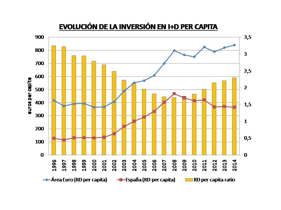 Pero la forma clásica de evaluar la inversión, como porcentaje del PIB, puede conducir a equívocos. Si este esfuerzo lo medimos como la inversión en I+D por habitante (gráfica siguiente), se puede apreciar una tendencia similar a la de inversión como porcentaje del PIB, con la salvedad de que el ratio AE/España en términos de porcentaje del PIB entre los años 2008 y 2014 pasa de 1,43 a 1,73; pero en términos de inversión per capita pasa de 1,7 a 2,29. Es decir, en el año 2014 la inversión per capita en el AE era más del doble que la española, resultado de un PIB per capita un 31,6% superior en el AE que España .