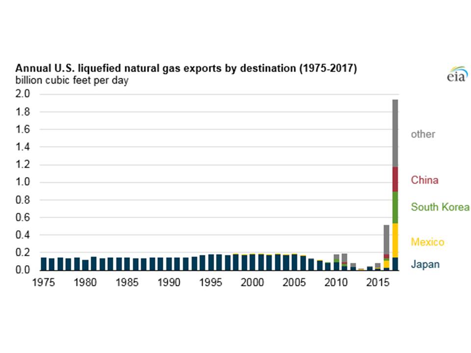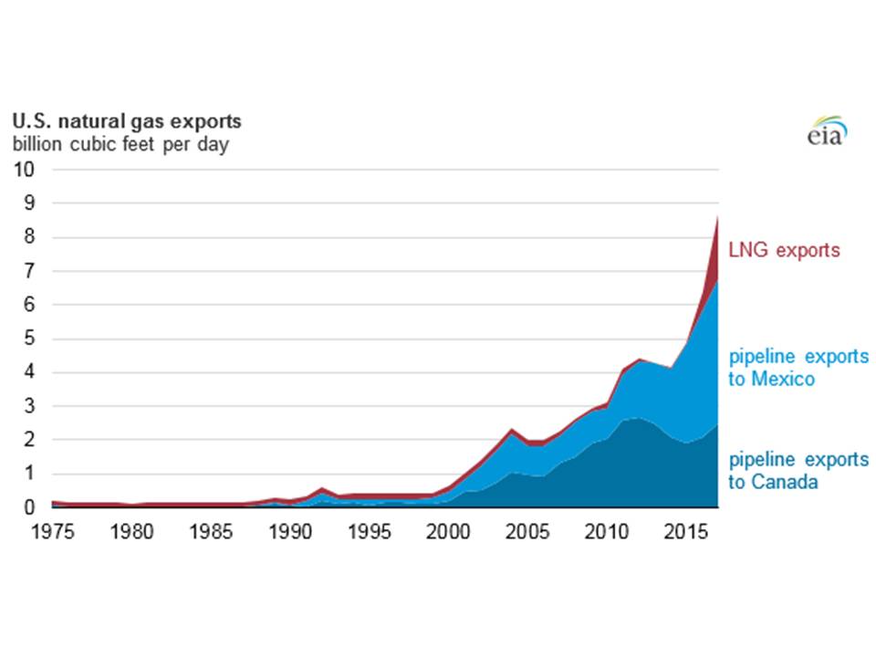 En lo que se refiere a las exportaciones de GNL, han experimentado un incremento espectacular en el año 2016, y mayor todavía en 2017, como resultado del incremento de capacidad de licuefacción al entrar en funcionamiento la instalación de Sabine Pass en 2016. A esta, posteriormente, y en este año, se unió la instalación de Cove Point, que el 1 de marzo de 2018 llevó a cabo su primer envío. Estando previsto que a estas se le unirán otros cuatro proyectos en construcción, previendo un incremento de la capacidad de licuefacción desde 3,6 bcf/día (miles de millones de piés cúbicos/día) a 9,6 bcf/día al final de 2019, lo que lógicamente dará lugar en paralelo a un incremento de las exportaciones de GNL.