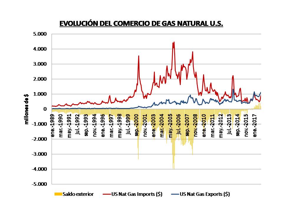 Lógicamente, la evolución de las exportaciones/importaciones de gas natural contribuyen al saldo de la balanza exterior estadounidense. En este sentido, el saldo comercial de gas natural ha pasado de contribuir negativamente en el año 2005 en unos 26.700 mill $, a una contribución positiva en el año 2017 de 2.950 mill $ (figura siguiente). Lo cual, sin embargo, tampoco parece cuantitativamente muy significativo dado el amplio déficit comercial estadounidense de 811.000 mill de $ .