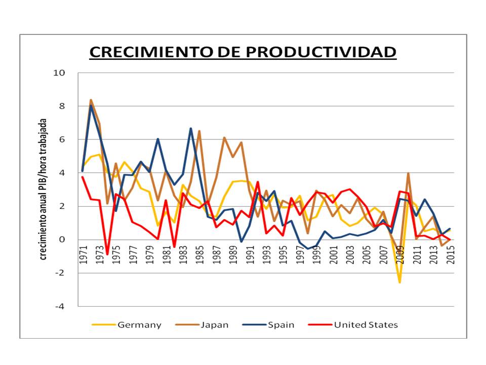 2.- Otro factor asociado es la evolución de la productividad, que desde hace años en los países desarrollados muestra una tendencia decreciente que contribuye a la menguante tasa de crecimiento del PIB (figura siguiente).