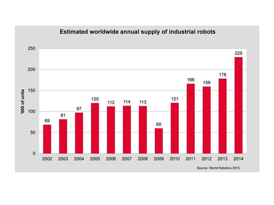 Esta evolución ha dado ligar a que el total de robots mundial al final de 2014 se situase en 1,5 millones. Estimándose que el crecimiento en el número de robots instalados será como mínimo del 15% anual hasta el año 2018, lo que supondrá la instalación de 1,3 mill de robots más a nivel mundial, pasando el número de robots instalados de 1,48 millones al final de 2014 hasta 2,23 mill a final de 2018.