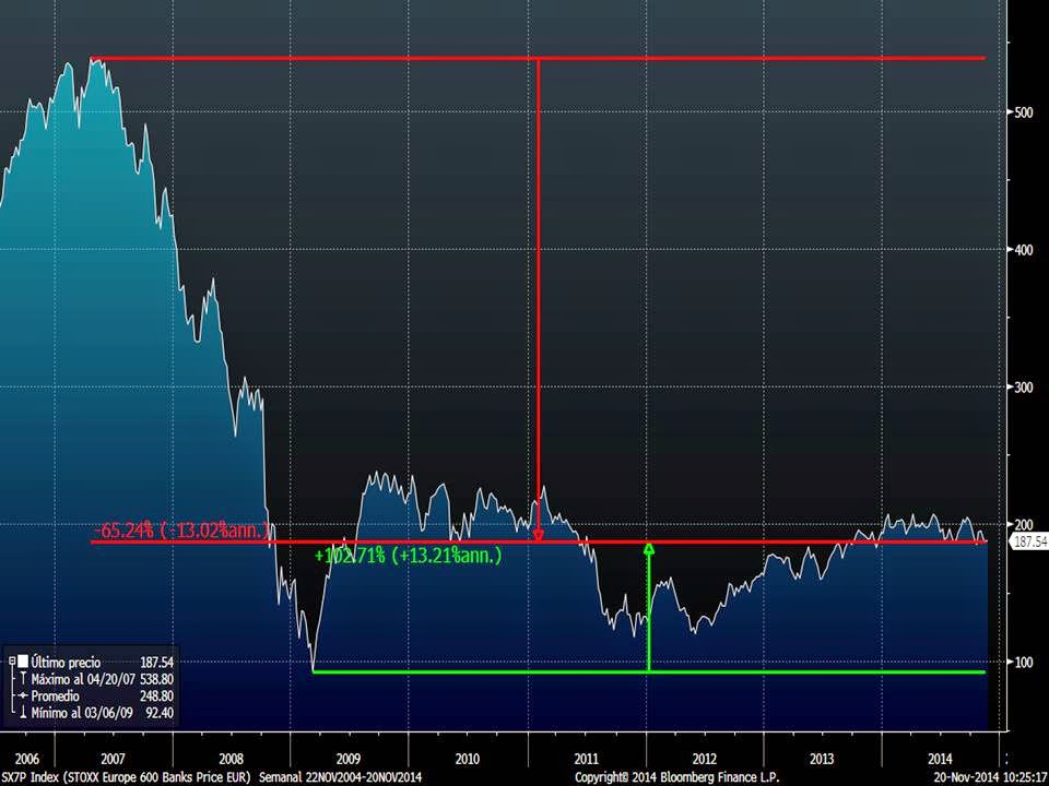 Evolución del precio del sectorial bancario del Eurostoxx 600. El índice ha subido un 102% desde los mínimos del 2009 y lejos de superar los máximos de ese año. La corrección desde máximos es nada menos que del 65%, por lo que lleva a la confusión a los inversores al pensar en el tremendo recorrido que tendría este sector para alcanzar los niveles a los que llegaron en el 2007.