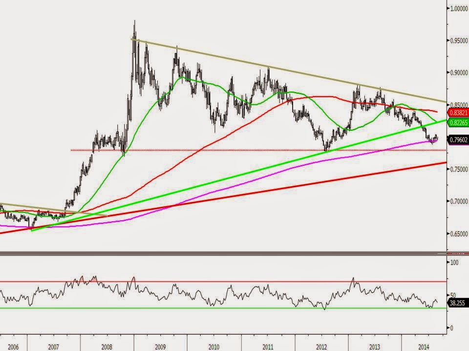 Respecto al dólar, el euro corrige un 5.8% desde el 8 de mayo, el día en el que Draghi se mostró preocupado por ver el euro tocar niveles de 1,40 y decir que la fortaleza del euro era preocupante para la recuperación económica (encarece exportaciones y abarata importaciones). En el gráfico se observa que el siguiente nivel claro de soporte se sitúa en la zona de 1.275, mínimos del año pasado. A priori, entendemos que estos serían los niveles en los que el BCE se encontraría cómodo, ya que las dos veces que ha perforado a la baja la zona de 1.25 dólares por euro, obligó al Mario Draghi a actuar para defender a nuestra moneda.