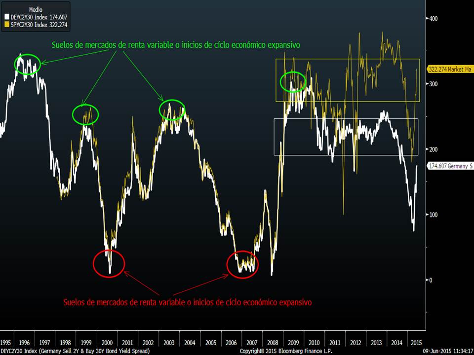 Y es que es evidente. Si un bono a 30 años ofrece la misma rentabilidad que un bono a 2 años, no tiene sentido arriesgar y los inversores se refugian en inversiones a corto plazo y por supuesto no tiene sentido arriesgar a invertir en renta variable. Y cuando la pendiente de la curva es muy alta, genera apetito por el riesgo. Lo que hemos vivido este inicio de año es que la pendiente de las curvas 20-30 años españolas y alemanas se había aplanado muy rápidamente por el miedo a la deflación y recesión en Europa que comenzó a descontarse el verano pasado. El BCE en marzo ha frenado de golpe esta sangría y ahora las pendientes de las curvas tanto española como europea están llegando a los niveles más acordes a la situación económica actual.