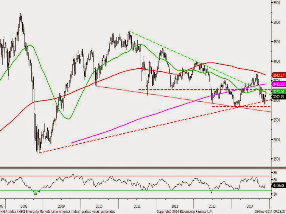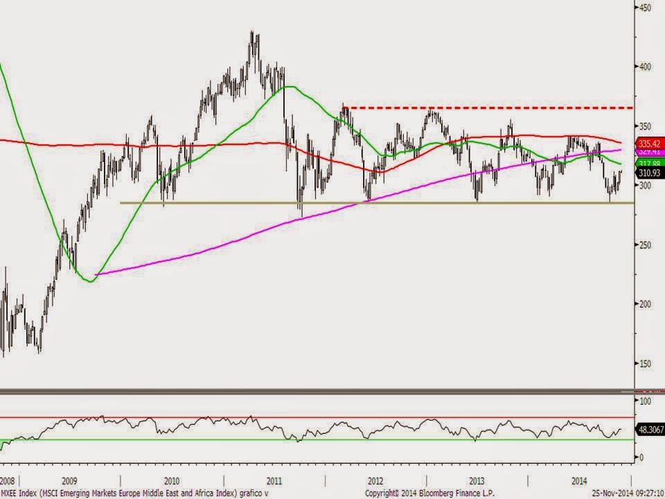 Así pues, con estos niveles alcanzados por el dólar o si se mira de otra forma, con la debilidad de las monedas emergentes y europeas, los inversores pueden pensar que los mercados emergentes han ganado la suficiente competitividad respecto a las compañías americanas y sean estas zonas geográficas las que estén mejor posicionadas para el próximo ejercicio 2015. Si miramos la situación técnica del MSCI emerging markets, vemos que aunque no termina de rebotar, se mantiene en la directriz alcista que une los mínimos desde 2009. Un cierre semanal por encima de 1.015 puntos significaría superar las medias de 50 y 200 sesiones y confirmaría el rebote.