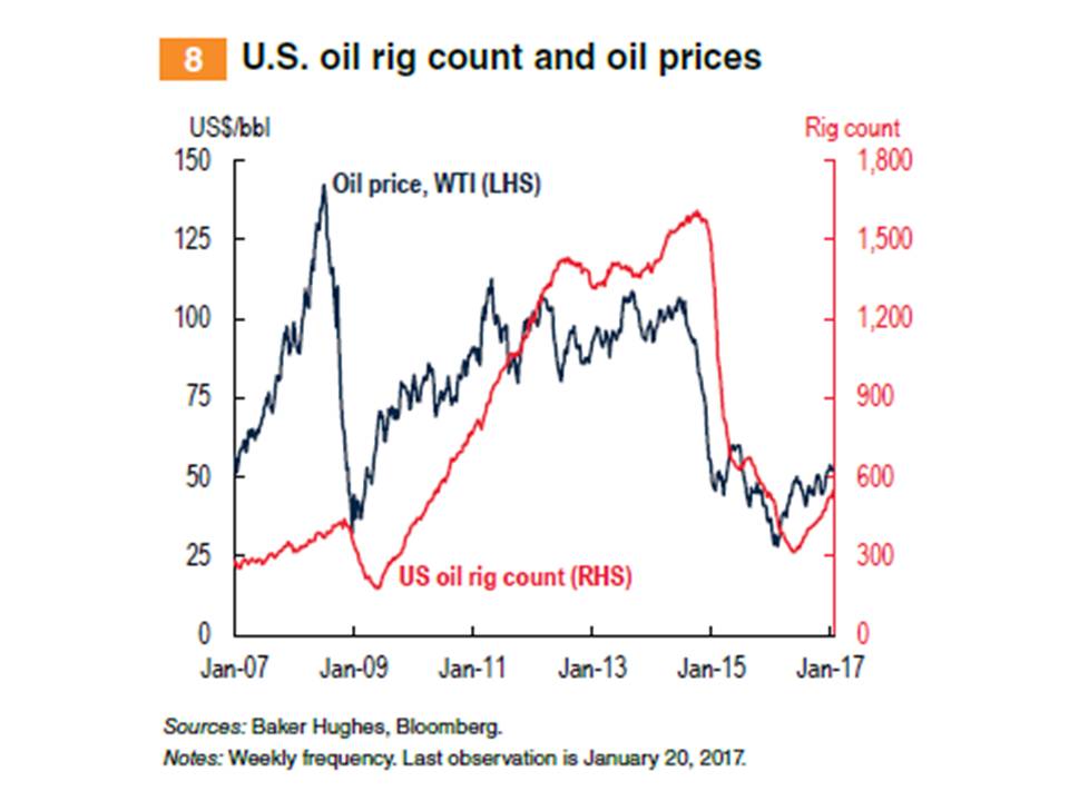 La situación es tal que la EIA prevé un incremento de producción de 300.000 bd este año y 500.000 bd en 2018, pudiendo ser estas proyecciones conservadoras, ya que no se puede descartar que mayores incrementos de eficiencia y reducción de costes, o nuevas medidas regulatorias sobre impuestos o limitaciones a la utilización de tierras para la exploración de recursos, entre ellos los situados en el Ártico, puedan impulsar la producción. Sin embargo, no todos los factores son positivos, ya que los incrementos de eficiencia no pueden ser indefinidos y también se está produciendo escasez de mano de obra cualificada, lo que puede impulsar salarios y costes.