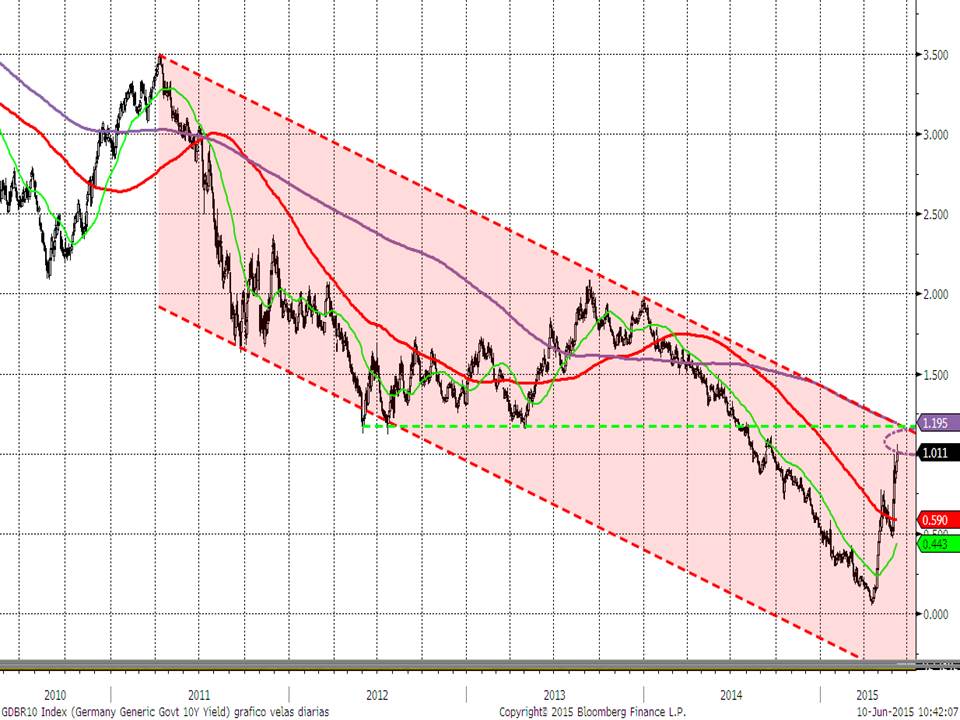 Hasta aquí el punto de vista técnico. Desde el punto de vista fundamental, los datos macro siguen siendo positivos, y sobre todo las expectativas de inflación seguirán presionando al alza los tipos de interés de plazos más largos. Los plazos más cortos en Europa de momento no tienen peligro puesto que no se aventuran subidas de tipos hasta como mínimo, finales del 2016. Pero es que desde que habló la semana pasada Draghi en la reunión del BCE, las expectativas de inflación han retomado la tendencia alcista. A cinco y 10 años, las expectativas de inflación están en máximos anuales (al 1,20% y 1.51%) y en el gráfico se aprecia cómo la TIR del bono alemán se está acercando claramente a las expectativas a cinco años. Entendemos que gracias al efecto del QE europeo, podrían mantenerse las tires por debajo de las expectativas, pero si estas siguen subiendo, será difícil pensar en un giro sostenible a la baja de las rentabilidades de los bonos a más de 10 años.