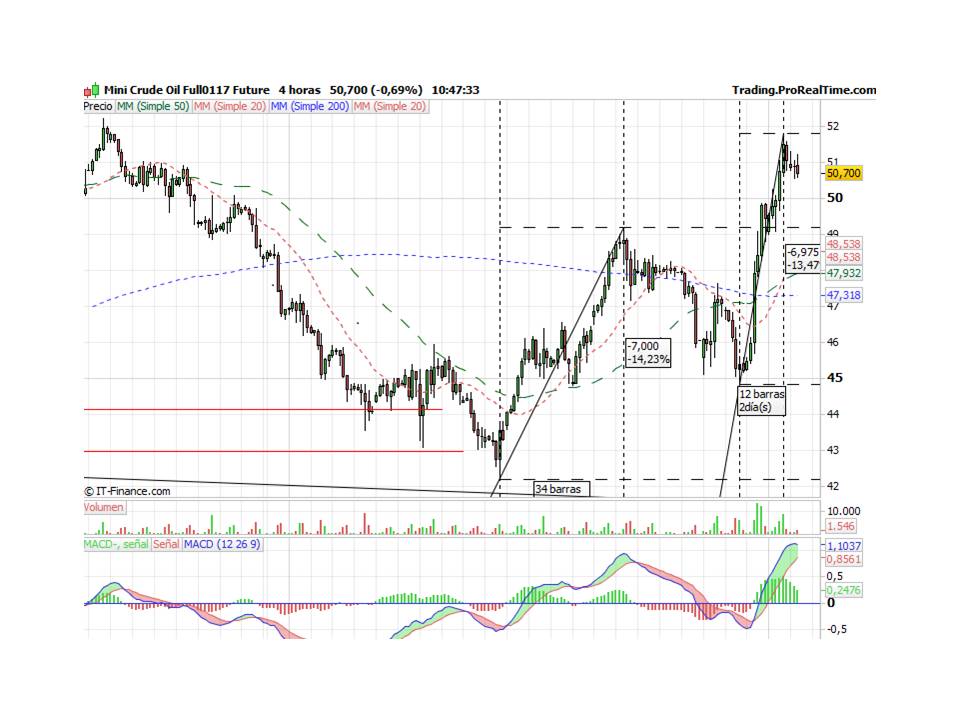 Desde el punto de vista de los precios, en el corto plazo, la tendencia al alza puede continuar, siendo interesante desde el punto de vista técnico tener presente la zona de resistencia que ya habíamos comentado anteriormente que rondaba la zona de 52$. En estos momentos, el precio ha llegado cerca de la resistencia mencionada en un movimiento de dos ondas de idéntica amplitud, que es algo habitual en el precio del barril y que se puede apreciar en el gráfico siguiente, con dos impulsos de unos 7 dólares que se acompañan de un estado de sobrecompra en el MACD, lo que asociado a un máximo de 51,8 $ reciente invita a pensar en una corrección.