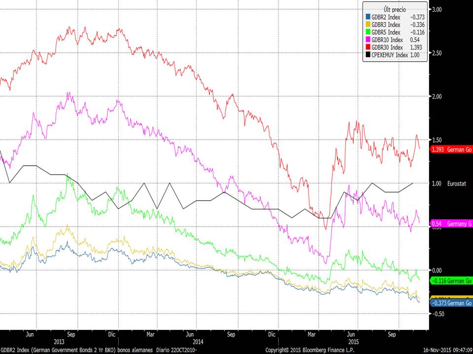 Ni siquiera los bonos están actuando como activo refugio claro. La rentabilidad de los bonos alemanes a 10 años baja 2 p.b. y la de los bonos de Estados Unidos baja 1.8 p.b., un recorrido similar al de los últimos días de la semana pasada en el que los inversores ya empezaron a comprar bonos debido a la debilidad mostrada por las bolsas y tratando de aprovechar el repunte de las rentabilidades de estos bonos en las semanas previas. En el siguiente gráfico de la rentabilidad de los bonos alemanes según plazo se observa lo comentado. Los máximos de rentabilidad se alcanzaron el pasado 6 de noviembre.