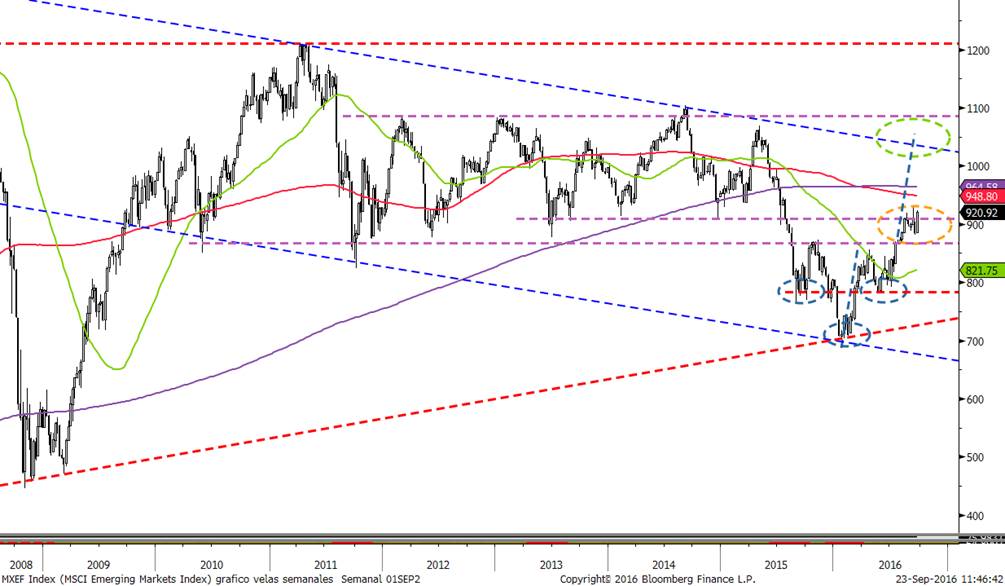 En cuanto a Emergentes, el MSCI Emerging Markets esta semana está superando la zona de 900 puntos al alza. Este era el nivel que desde 2013 a 2015 funcionó como soporte y su pérdida el verano pasado por la devaluación del Yuan, provocó fuertes caídas hasta la base del canal bajista de los últimos 6 años que se dibuja en azul. Este verano decíamos que el MSCI Emerging Markets estaba dibujando una figura de suelo en forma de H-C-H invertido y que en agosto había superado la línea clavicular. El objetivo lo situábamos en nivel de 1.000 - 1.050 puntos. Tras frenarse en la resistencia comentada, parece que los emergentes se dirigen a cumplir el objetivo.