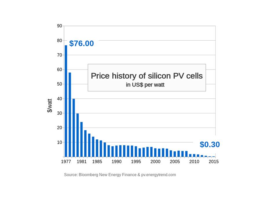 En la reducción del LCOE de la energía solar fotovoltaica ha jugado un papel la reducción de de los paneles, que tal como muestra la figura siguiente se ha reducido desde 76,67$/wt instalado en 1977 a los 0,3$ en 2015, lo que equivale a una reducción de precio en el periodo señalado mayor del 99%.
