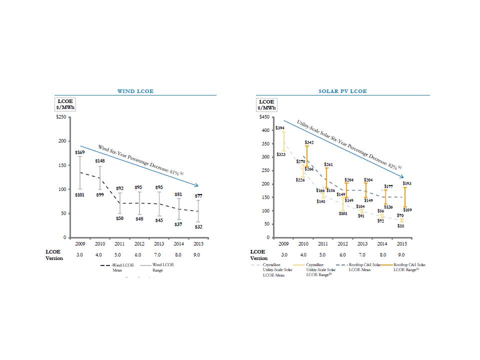 En este sentido, el informe de Lazard del año 2015 , analizando la evolución del LCOE de la energía eólica y solar nos indica que entre los años 2009 y 2015, el LCOE de la energía eólica de media se ha reducido un 61% hasta los 54,5 $/MWh y la solar fotovoltaica mayorista un 82% hasta los 64$/MWh, mientras que la distribuida o minorista es más cara, con un LCOE de 151 $/MWh (figura siguiente). Los datos mencionados son datos medios de LCOE, pero reflejan claramente que, la energía eólica presenta menor coste que la solar fotovoltaica y que dentro de esta la distribuida es 2,35 veces más cara que la mayorista. Mientras que dicho estudio también establece el LCOE del carbón entre 65-150$/MWh y el de gas natural mediante ciclos combinados entre 52-78$/MWh, y por tanto que en determinados casos la energía eólica y solar presenta menores valores de LCOE que el carbón y los ciclos combinados.