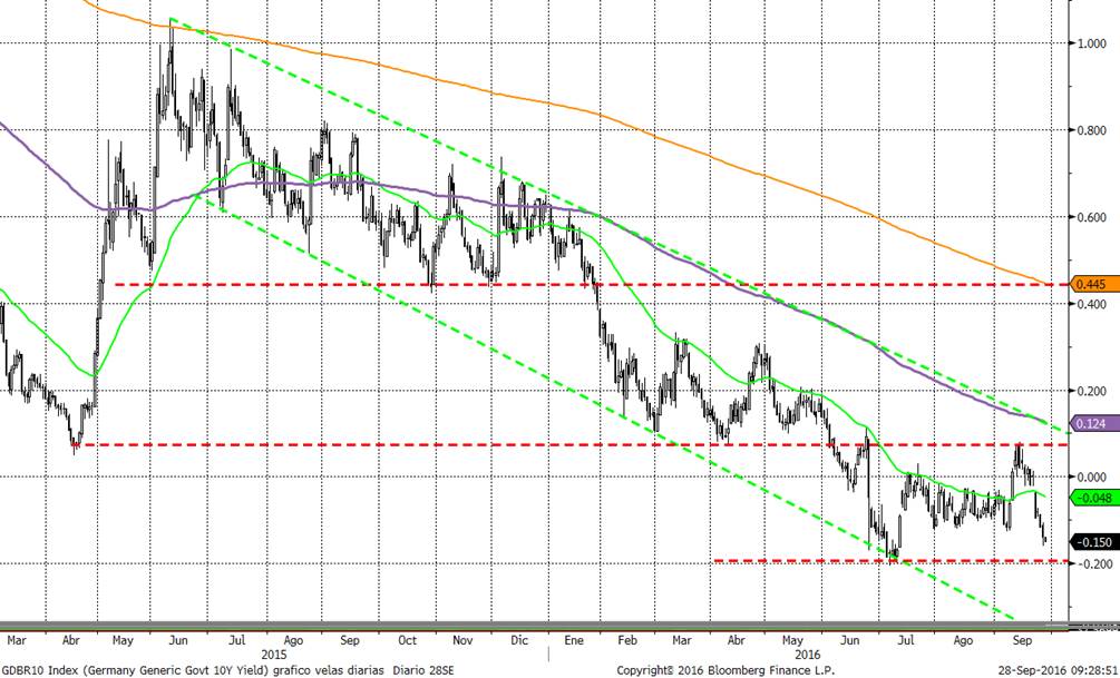 Si en el día de ayer comentábamos que los bancos no pierden oportunidad de demostrar que están inmersos en una tendencia bajista, hoy podemos observar que el precio de los bonos refleja justo lo contrario. Cualquier corrección en precio la aprovechan los inversores para comprar bonos. Hoy, de nuevo, tenemos la rentabilidad de los bonos alemanes en zona de mínimos históricos, alcanzando el bono a 10 años la rentabilidad del -0.15%. En el gráfico podemos ver que tras el intento fallido de superar la resistencia del 0.07%, las rentabilidades se han ido de nuevo a mínimos históricos, acercándose hoy al nivel de mínimos del Brexit en el -0.20%.