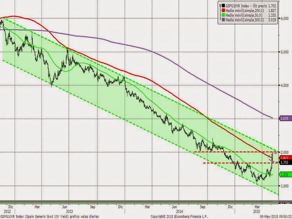 Evolución del bono a 10 años español. Ayer tocó el 2% y se giró a la baja. Hoy ya cotiza en el 1.70% esos 30 p.b. de tir suponen una subida de cerca del 3% en el precio del bono del estado de referencia de abril del 2025.